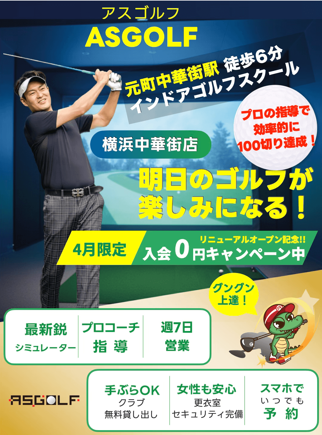 ゴルフは「正しい知識」と「続けやすい環境」が揃えば、どなたでも必ず上達できます。ASGOLFでは、一人ひとりのレベルや目標に合わせたレッスンを行い、最短距離で成長できるよう丁寧にサポートします。初心者の方も、ブランクがある方も大歓迎です。まずは気軽に体験で雰囲気を感じてください。中華街に遊びついででも大丈夫です(^^)。一緒に、楽しみながら理想のスイングをつくっていきましょう。ゴルフのことはもちろん、ゴルフ以外のこともたくさん共有できたら嬉しいです。